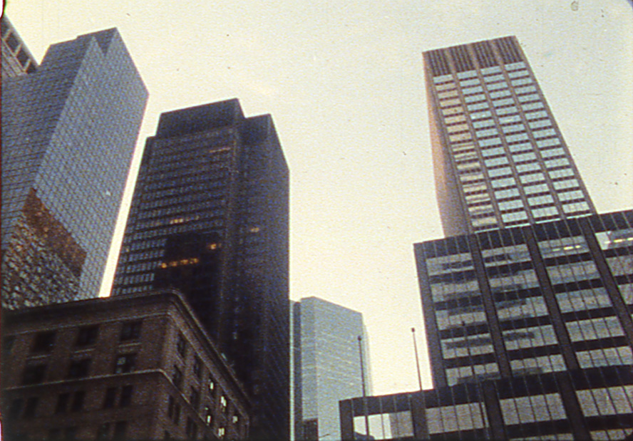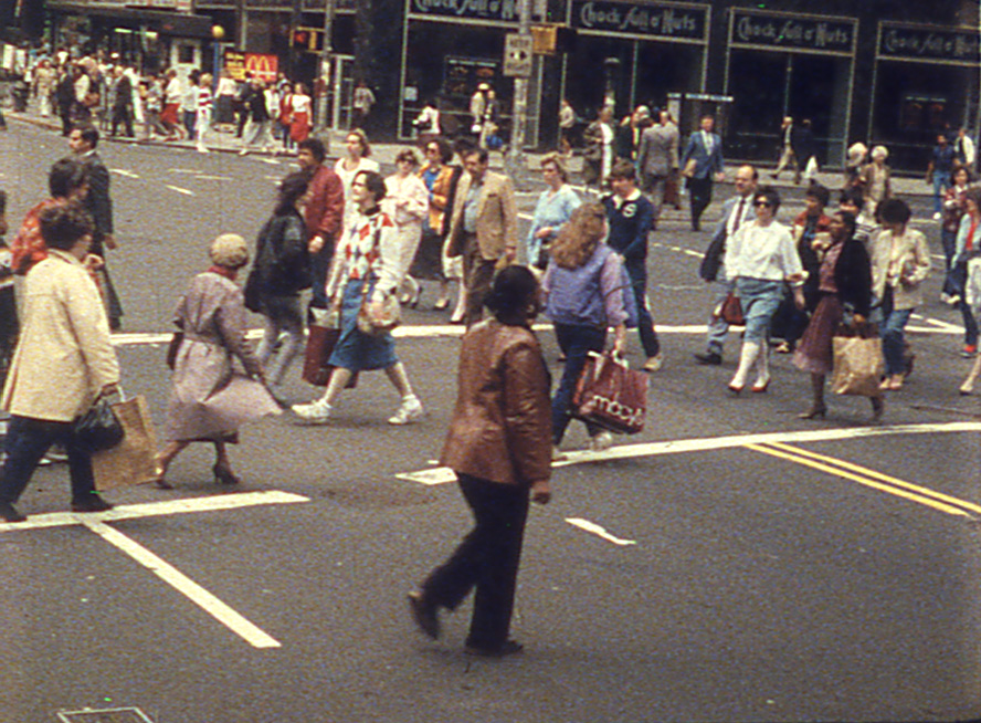 «Un enorme camión con remolque branco interrompe por pouco o avance dun grupo de persoas que cruzan unha concorrida avenida de Manhattan. Retroceden o xusto para deixarlle o espazo necesario para pasar e continúan mecanicamente o seu camiño. Esta é a coreografía pragmática da cidade, a gran danza que se move continuamente nun espazo tan restrinxido. Esta é tamén a secuencia inicial de DANCERS, BUILDINGS AND PEOPLE IN THE STREET, cuxo título provén do profundo e incisivo libro de ensaios sobre danza de Edwin Denby. A infinita enerxía visual da cidade foi un dos temas principais da cámara de Burckhardt durante máis de corenta anos. Aquí, esta mostra das texturas e seccións transversais de Nova York xustaponse coa creación dunha obra de danza, Jig Jag, do coreógrafo e bailarín Douglas Dunn e a súa notable compañía. O humor natural e a brusquidade clasicamente tenra dos seus xestos e frases son fermosas ampliacións ou detalles, a escala humana, a escala animal, corpo a corpo, dos vectores de forma e relación na vida urbana coidadosamente observada no exterior. A tensión entre estes dous mundos edítase maxistralmente dun lado a outro e culmina nunha fermosa conclusión na noite». – Reed Bye.